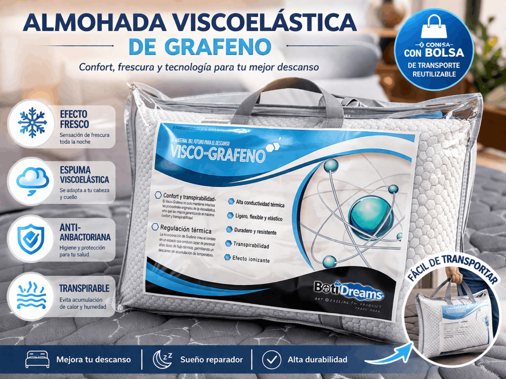 Botidreams presenta: La almohada del futuro para el descanso VISCO-GRAFENO. -Confort y transpirabilidad- El visco-grafeno no sólo mantiene intactas las propiedades originales de la viscoélastica,sino que la mejora garantizando el máximo grado de confort y transpirabilidad.
