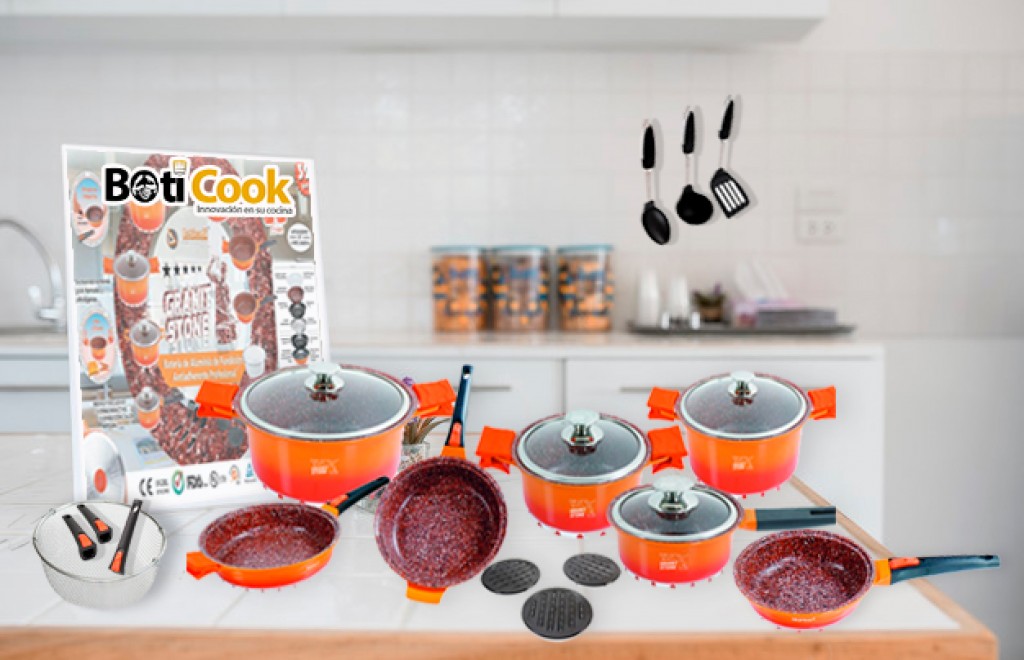 Esta bateria de cocina que le propone Expodirect esta realizada en aluminio de fundición que, gracias a la estructura de espesores discontinuos, mejora la cocción haciéndola uniforme tanto a temperaturas bajas o medias.