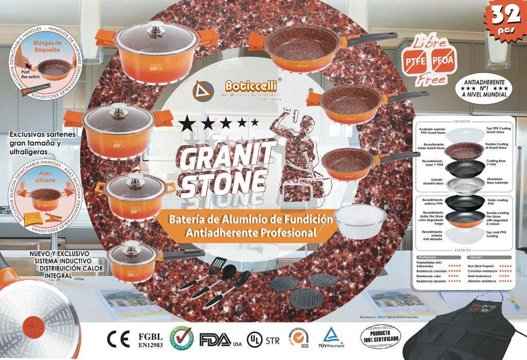 Anti-adherente Granit Stone©. Ecológico e inocuo para la salud. Granit Stone© garantiza que la capa de componente inorgánico está realizada con componentes cerámicos de alta calidad, proporcionando en la cocción del material un componente cerámico ultra resistente a la abrasión y ralladuras, así como completamente libre de perfluorocarbonos, gases tóxicos que liberan los antiadherentes habituales.