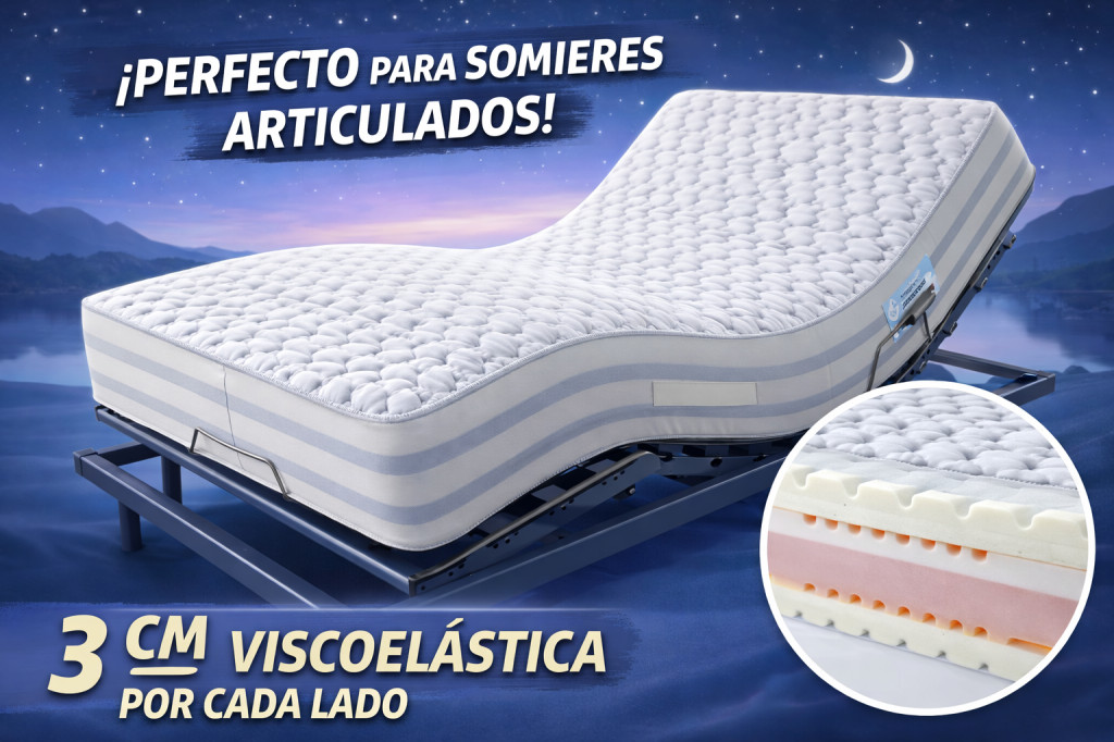 Sus 4 cm de viscoelástica hacen que su comodidad sea superior debido a la capacidad de adaptación, el colchón se adapta a tu cuerpo, es totalmente anatómico, los movimientos serán suaves y tu relajación superior, por supuesto, tu descanso inmejorable. La viscoelástica proporciona un confort y una adaptación ideal para liberar todo el estrés que acumulamos durante el día.