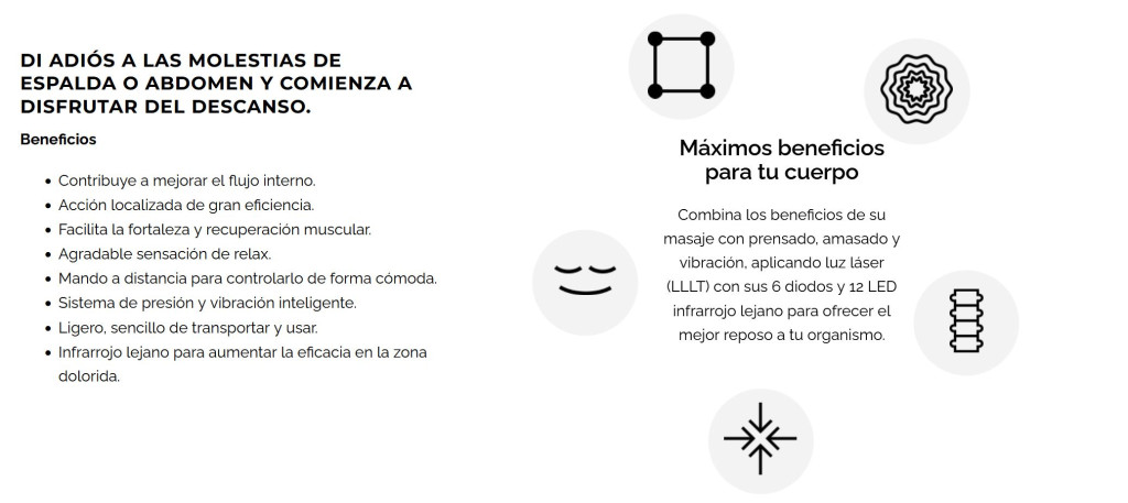 El MASAJEADOR LH LASER DE ESPALDA Y ABDOMINAL es un dispositivo revolucionario que combina tecnología de masaje, láser con vibración Undulhar System® y los beneficios de su sistema de calor por infrarrojo lejano, para aportarle a tu cuerpo el descanso que necesita.